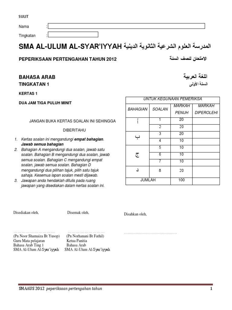 Soalan Pertengahan Tahun Bahasa Arab Ting 1 Pdf